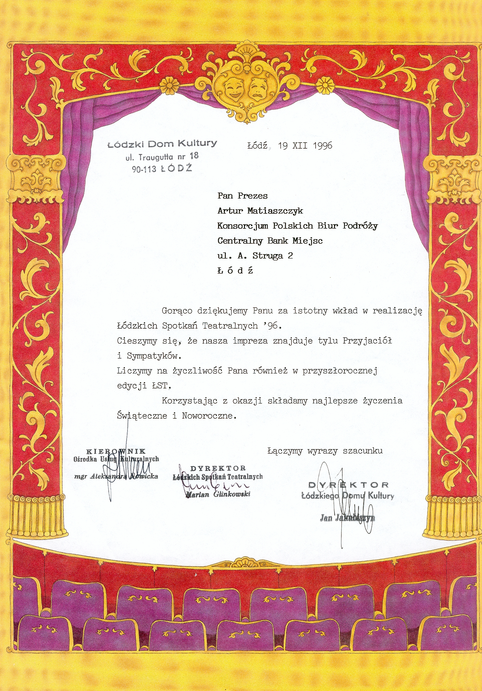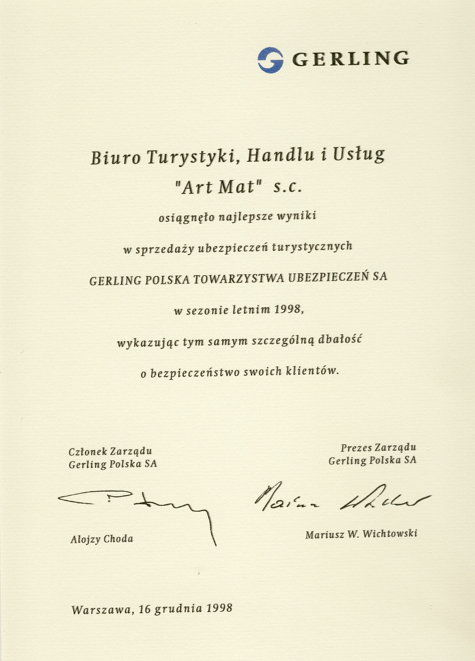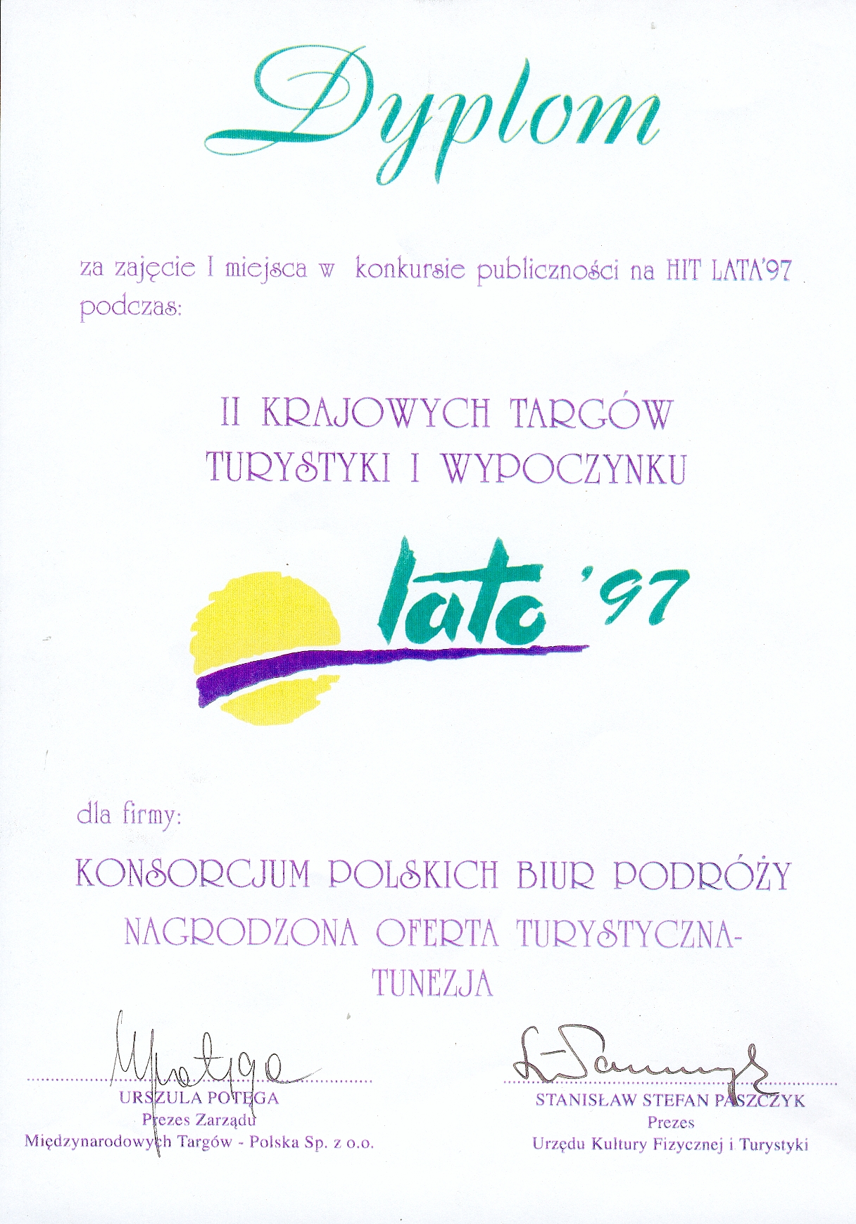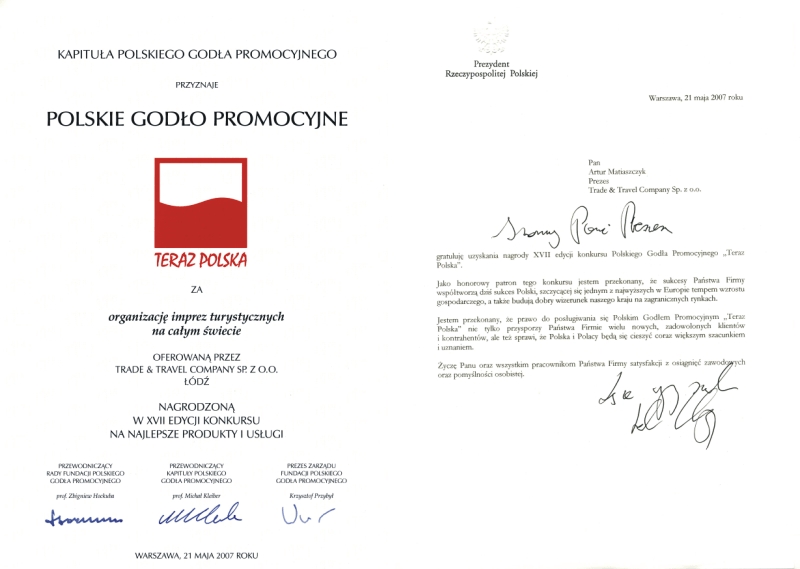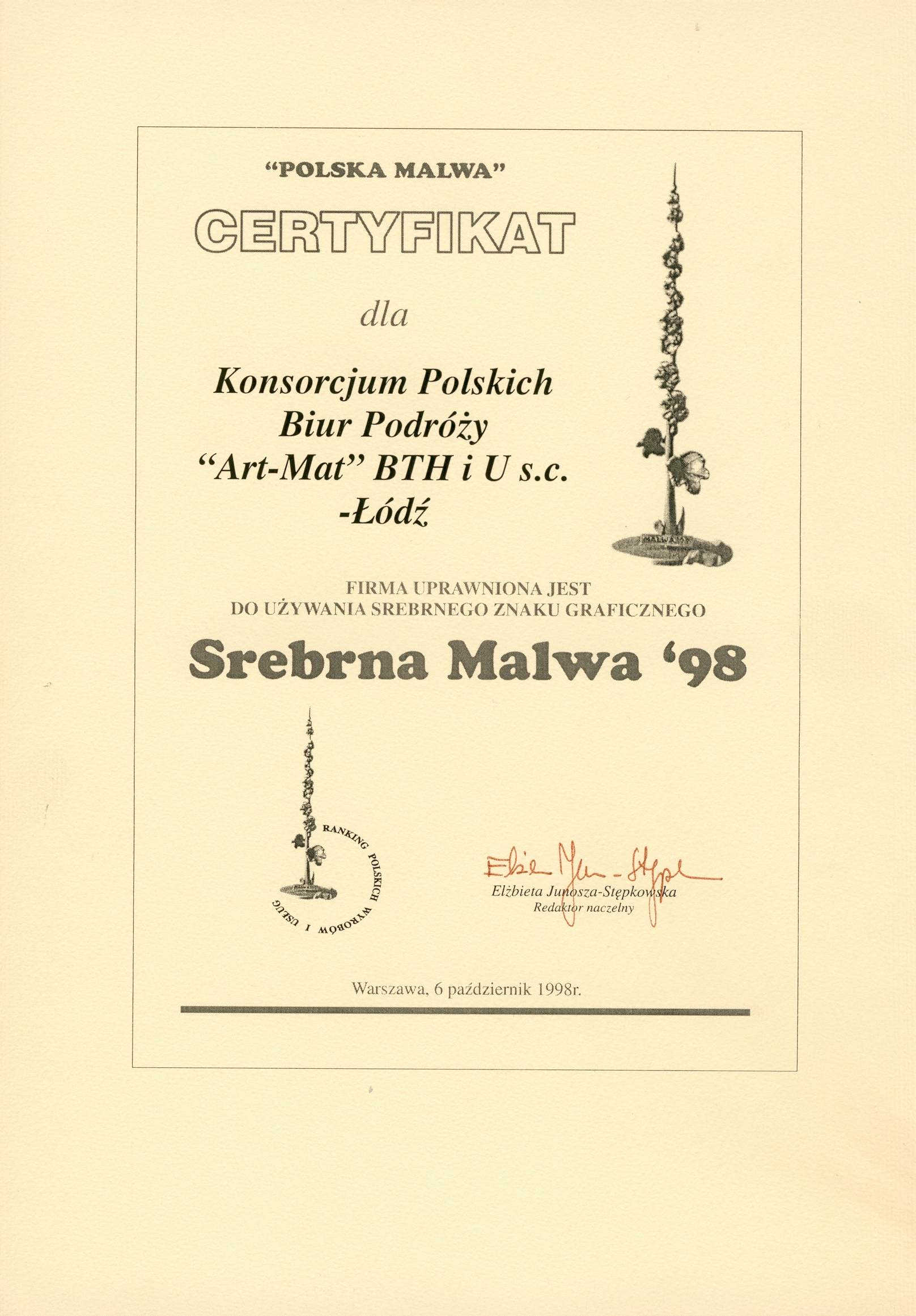 Uzyskaliśmy tytuł Jakości Roku, przyznany przez Ekspertów Polskiego Centrum Badań i Certyfikacji. Nasi pracownicy otrzymali imienne wyróżnienia. Nasze laury to Srebrny i Złoty Krzyż Zasługi dla Artura Matiaszczyka, Brązowy Krzyż Zasługi dla Barbary Ladżyńskiej oraz Odznaczenia resortowe za zasługi dla rozwoju turystki: dla Artura Matiaszczyka i Barbary Ladzyńskiej, Wiesławy Motylskiej, Małgorzaty Wołodkiewicz. Nasza firma również została odznaczona tym zaszczytnym medalem.